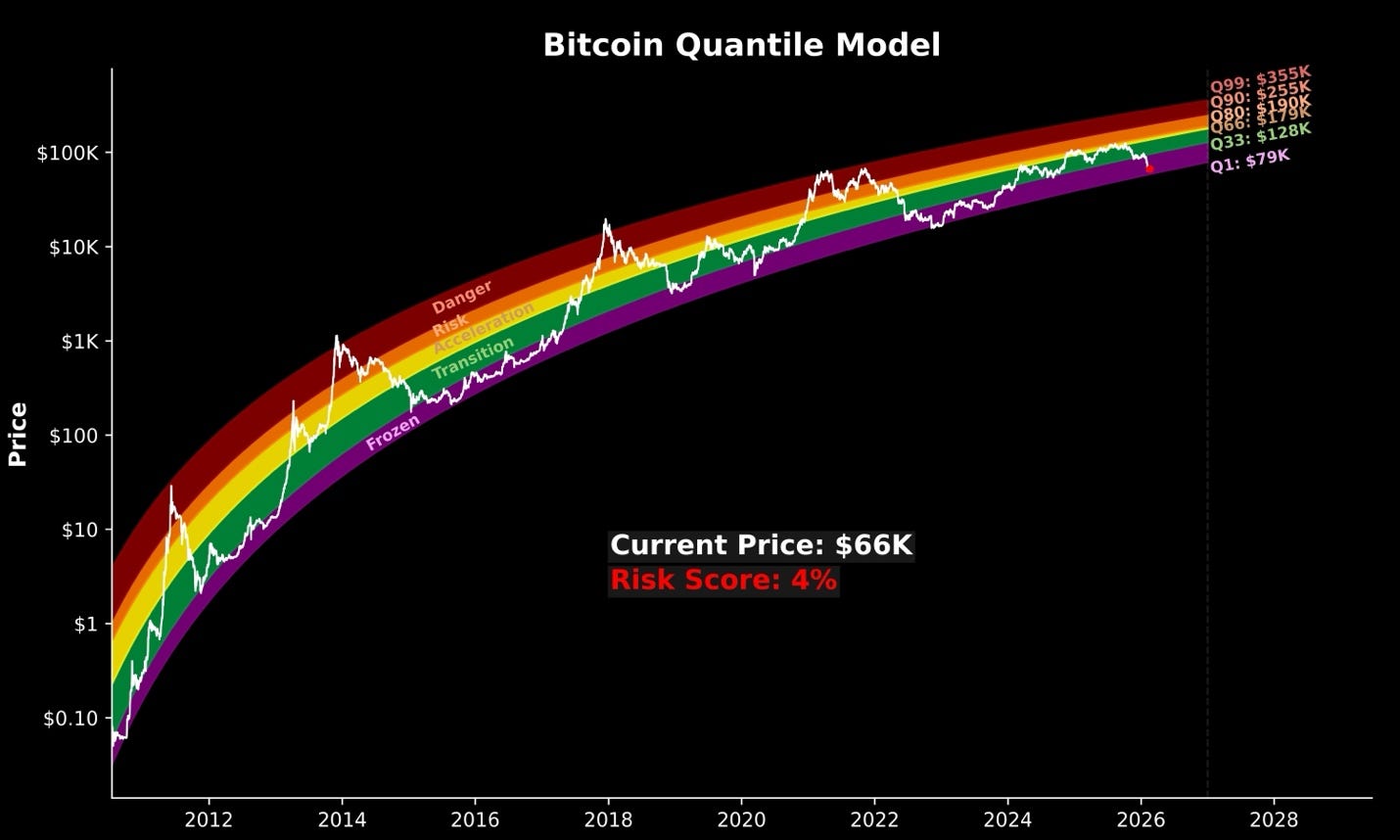 On the closer view, Bitcoin is around $66K, and the model’s risk score is about 4%. Interpreting that plainly, relative to this long-term trend framework, Bitcoin has been cheaper than this level only about 4% of the time across its observable history, as measured by this model’s placement along the quantile bands. That is not a statement about tomorrow’s price action, it is a statement about historical positioning. By this yardstick, we are sitting in a region that has usually been associated with depressed valuation and lower long-run risk, not no risk, just lower in the context of cycle history.