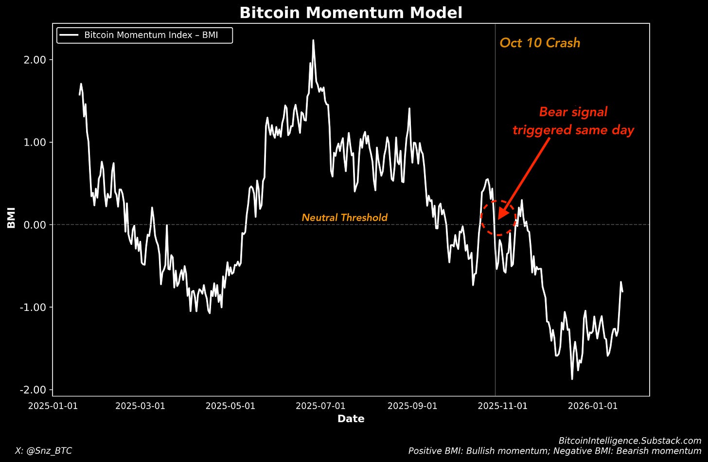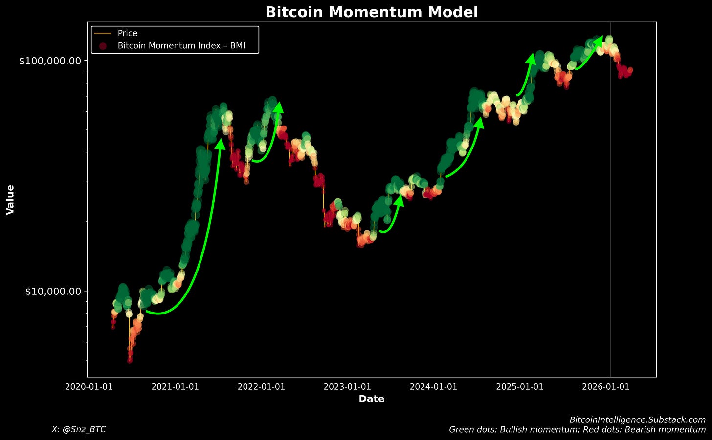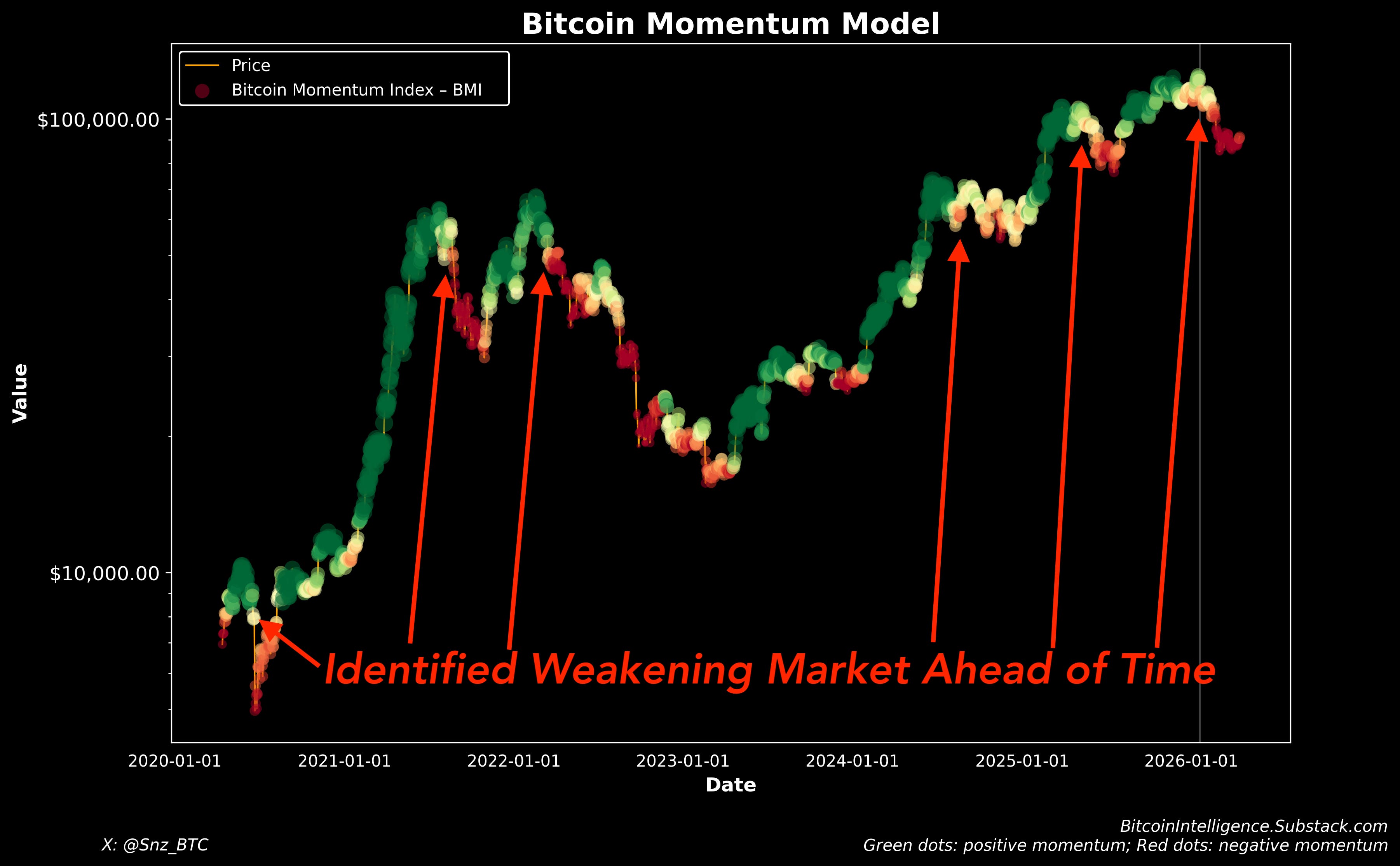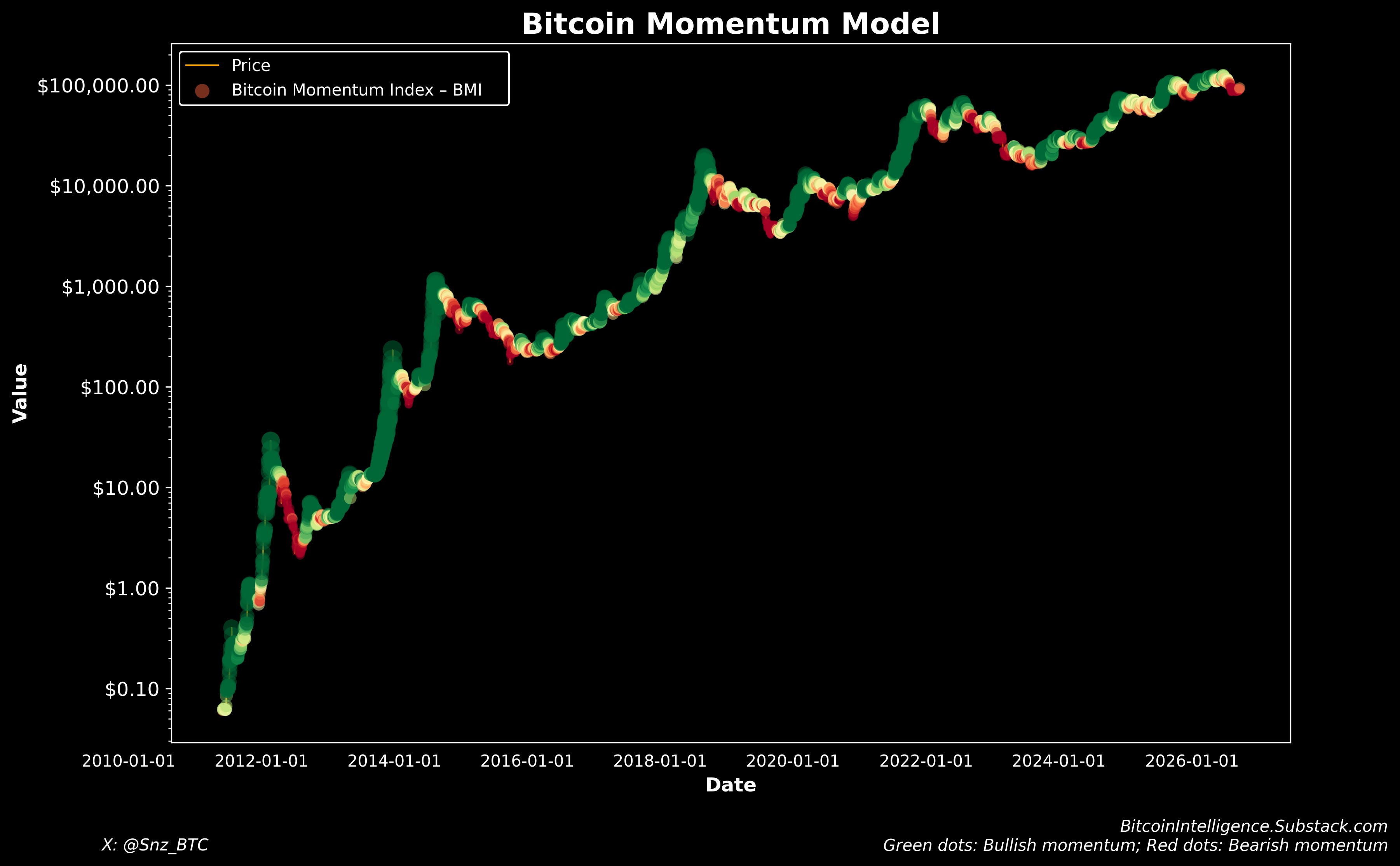 The outcome is a metric derived from Bitcoin’s momentum calculated from the last several months of price action, combined with additional safeguards to minimize the impact of short-term noise. The result is a striking ability to identify topping and bottoming patterns, with the ultimate goal of improving investment risk management rather than chasing price alone.