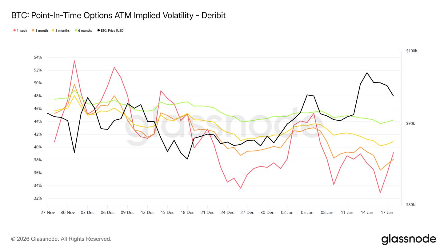 Volatility responded to the rally as Bitcoin tested the high 90s, but the reaction proved shallow and short-lived. While near-dated implied volatility adjusted quickly to extend higher, this repricing was tactical rather than structural—a distinction observed through point in time implied volatility, which preserves the specific sequencing of market reaction rather than smoothing it into averages. The spike in near-dated vol reflected an immediate demand for convexity as price accelerated toward the 100k psychological barrier, yet that response dissipated almost immediately upon the rally stalling.