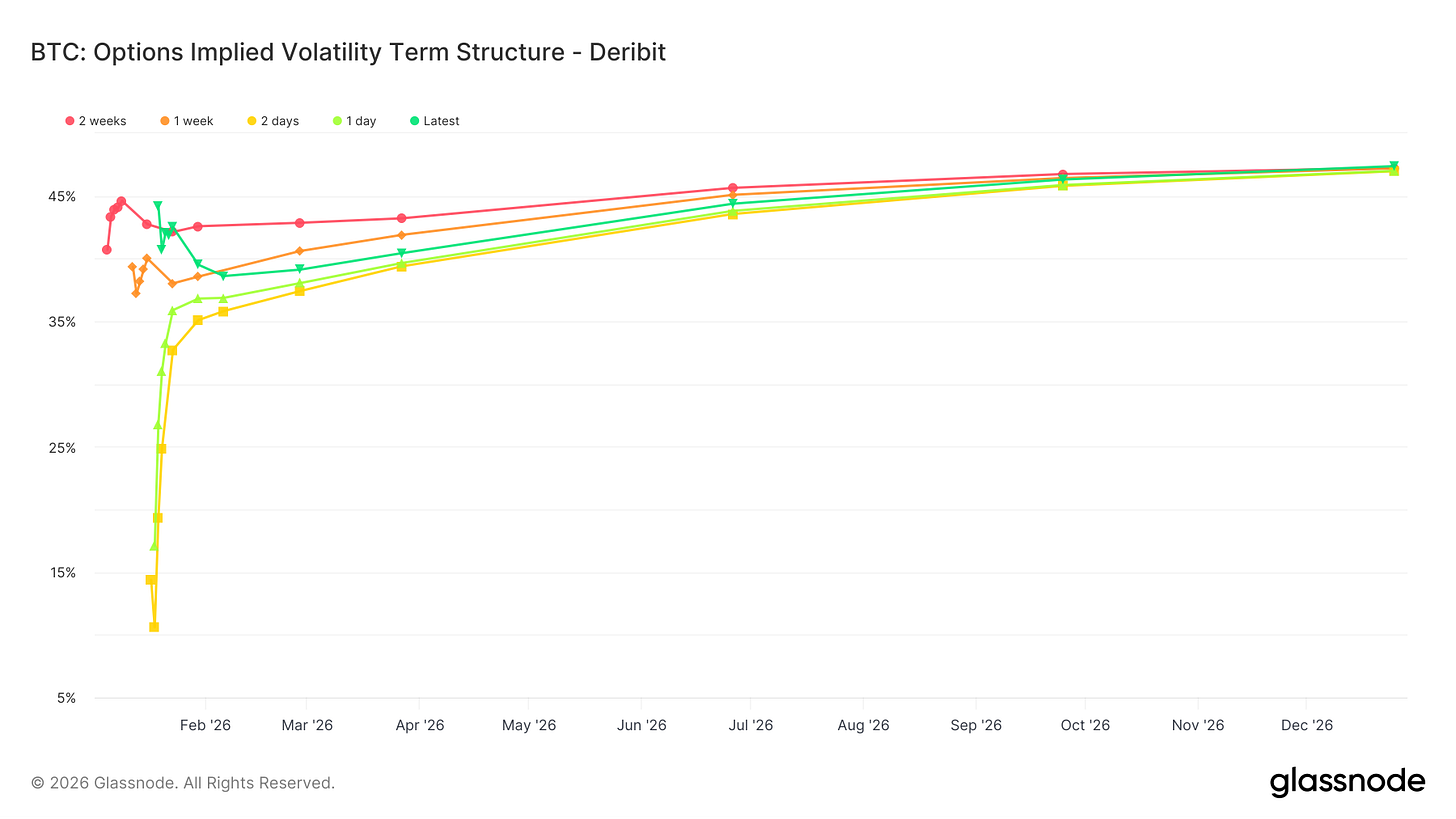 Implied volatility term structure reinforces the interpretation that recent risk pricing was reactive rather than predictive. Across maturities, the curve remains largely intact, with no meaningful inversion or acceleration that would suggest the market is pulling uncertainty forward in time. The front end of the structure shifted during the advance, but the curve failed to detach from the rest of the structure. The slope flattened modestly during the rally and then normalized quickly as price retraced, indicating that short term uncertainty was acknowledged but not escalated into a broader stress regime.
