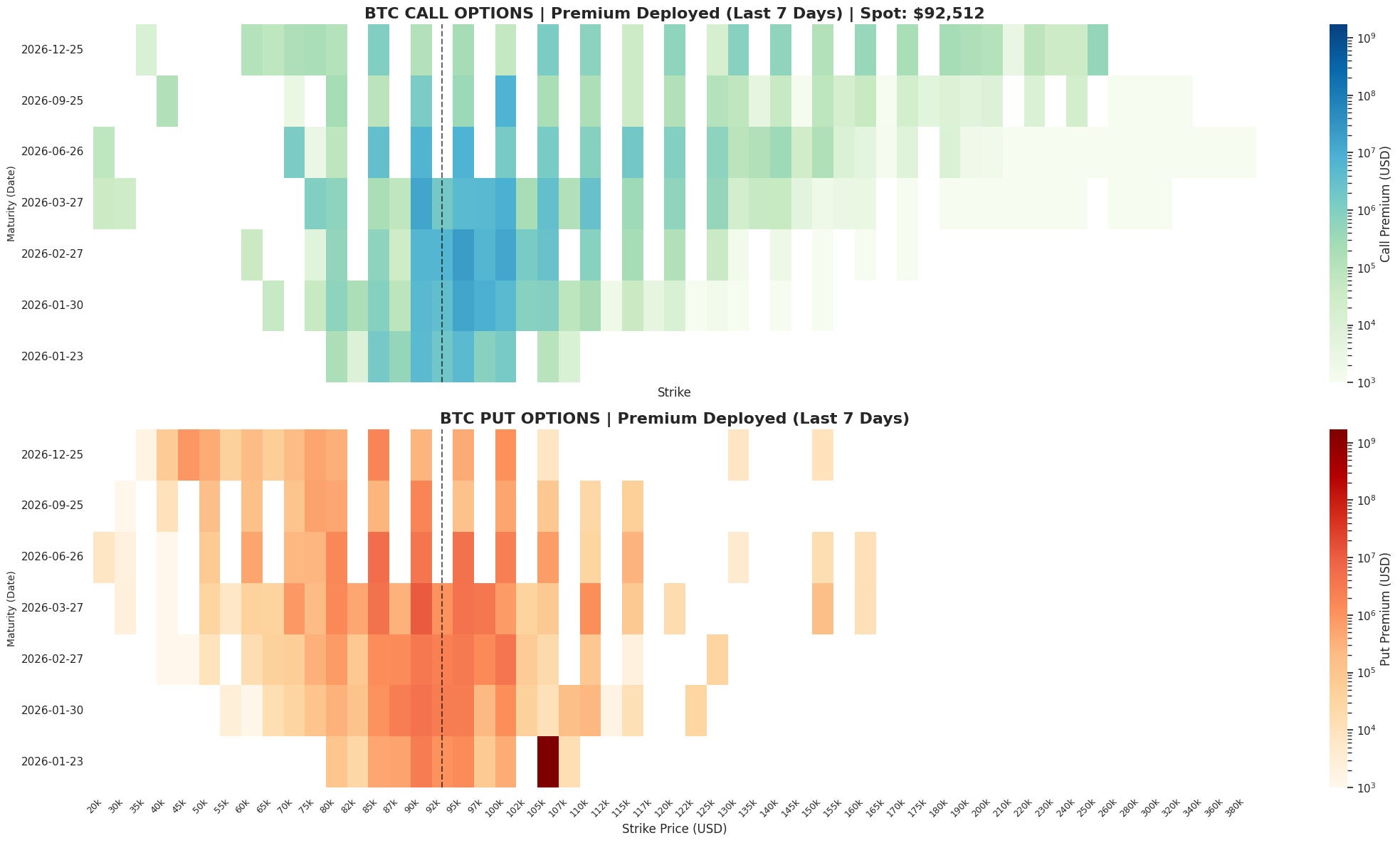 The chart above aggregates options premium deployed over the past seven days across all strikes and maturities, isolating market behaviour during Bitcoin’s advance toward the high 90s and its subsequent pullback. Rather than reflecting accumulated positioning, this window captures how participants responded to the move as it unfolded and how risk was repriced once momentum stalled. Call premium remains concentrated near spot across near and intermediate expiries, indicating that upside convexity continued to attract demand during the rally phase. However, this activity did not propagate meaningfully higher along the strike ladder. Premium thinness quickly becomes evident beyond the immediate spot region, suggesting that upside engagement was tactical rather than structural; participants paid for convexity close to the money but did not commit aggressively to tail outcomes.