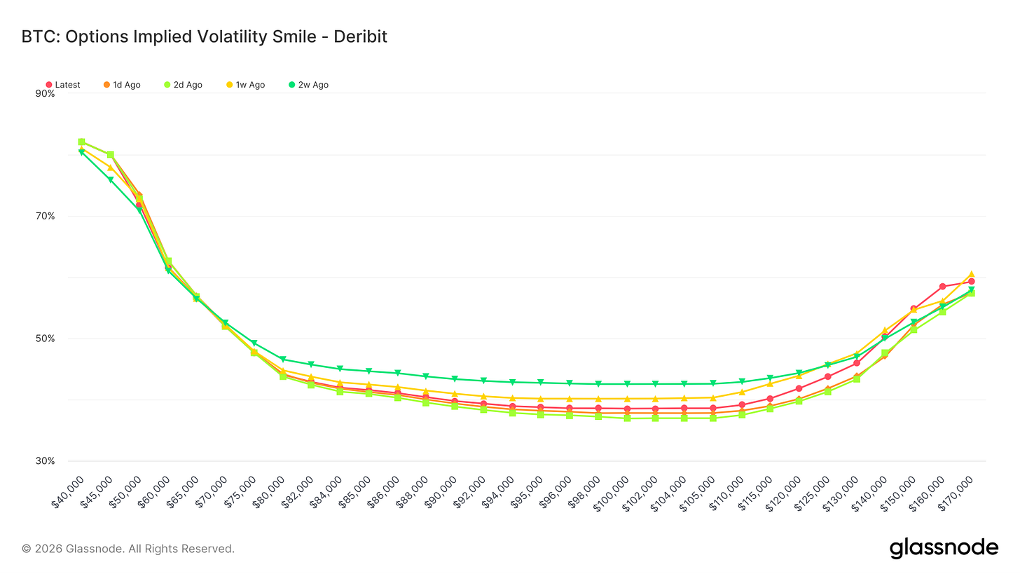 Bitcoin’s advance toward the high 90s and the subsequent pullback did not produce a durable repricing of market uncertainty. Premium was deployed primarily near spot strikes, suggesting active engagement with convexity during the move, but that demand did not extend meaningfully up the strike ladder.