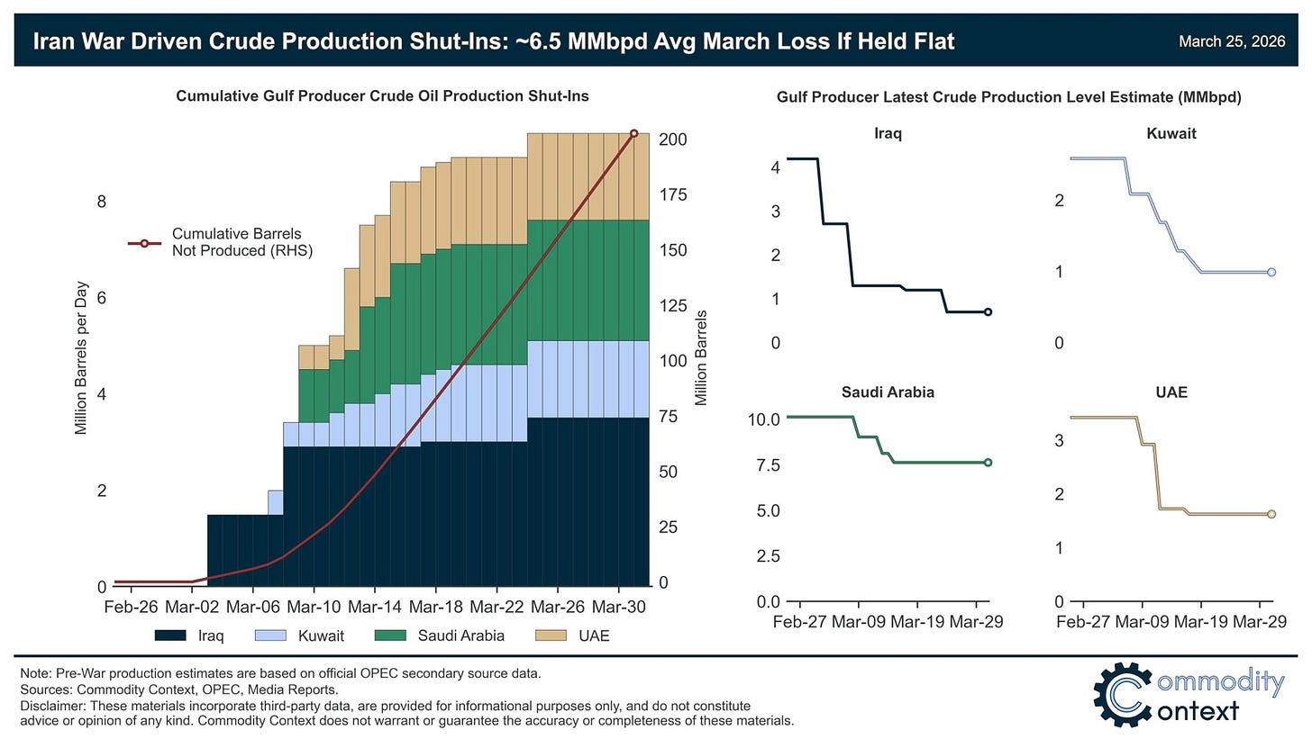 Estimates point to an initial disruption of roughly 6.5 million barrels per day of Persian Gulf production shut-ins. Cumulative lost output is already measured at around 200 million barrels. A multi-week disruption becomes a compounding supply loss, getting worse by the day.