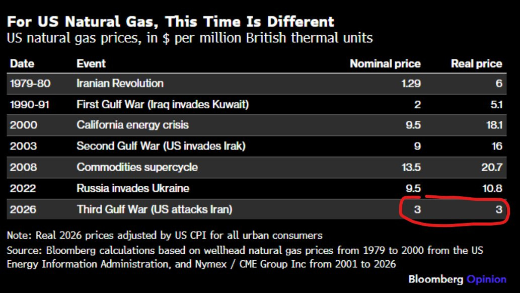 Natural gas feeds directly into industrial activity, electricity costs, and therefore into the broader inflation-growth mix. If US natural gas is not exploding, then the pass-through into the real economy may be less severe than the oil panic suggests.