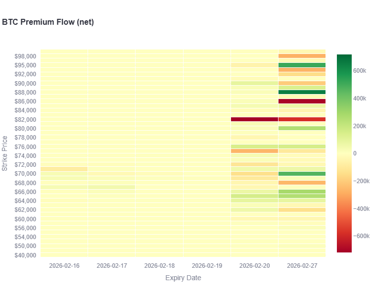 The net heatmap makes this clear. Most strikes sit close to neutral, particularly in the earlier February expiries. However, within February 27, localized pockets of imbalance emerge. There is visible net selling clustered around the low 80s, while net buying appears concentrated in the high 60s and low 70s. Higher strikes show selective upside participation, but not in overwhelming size.