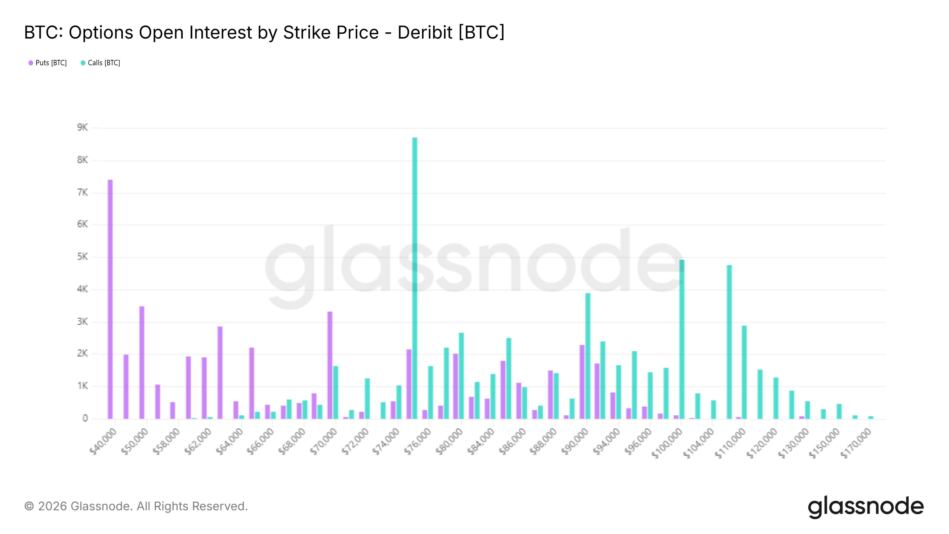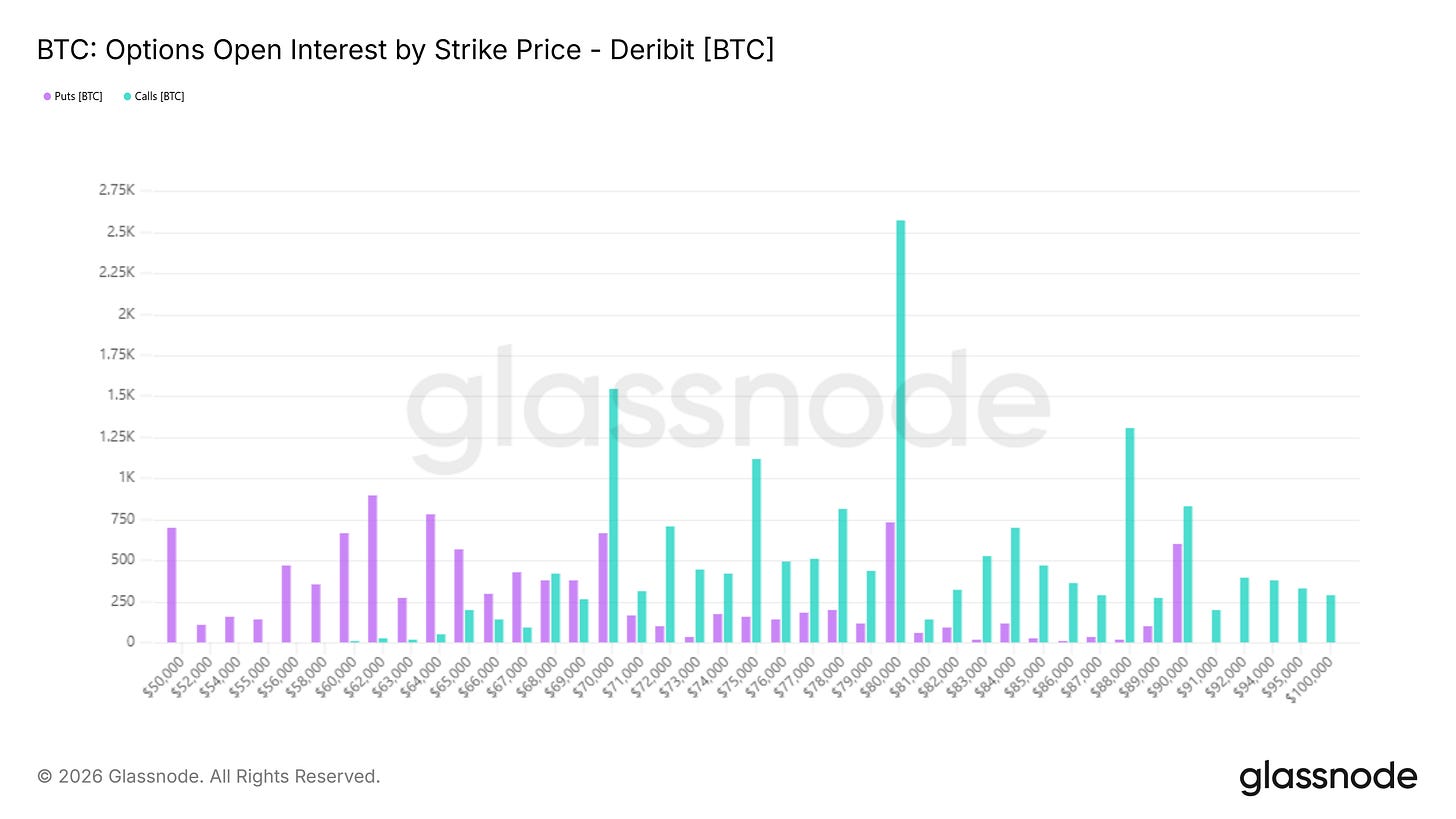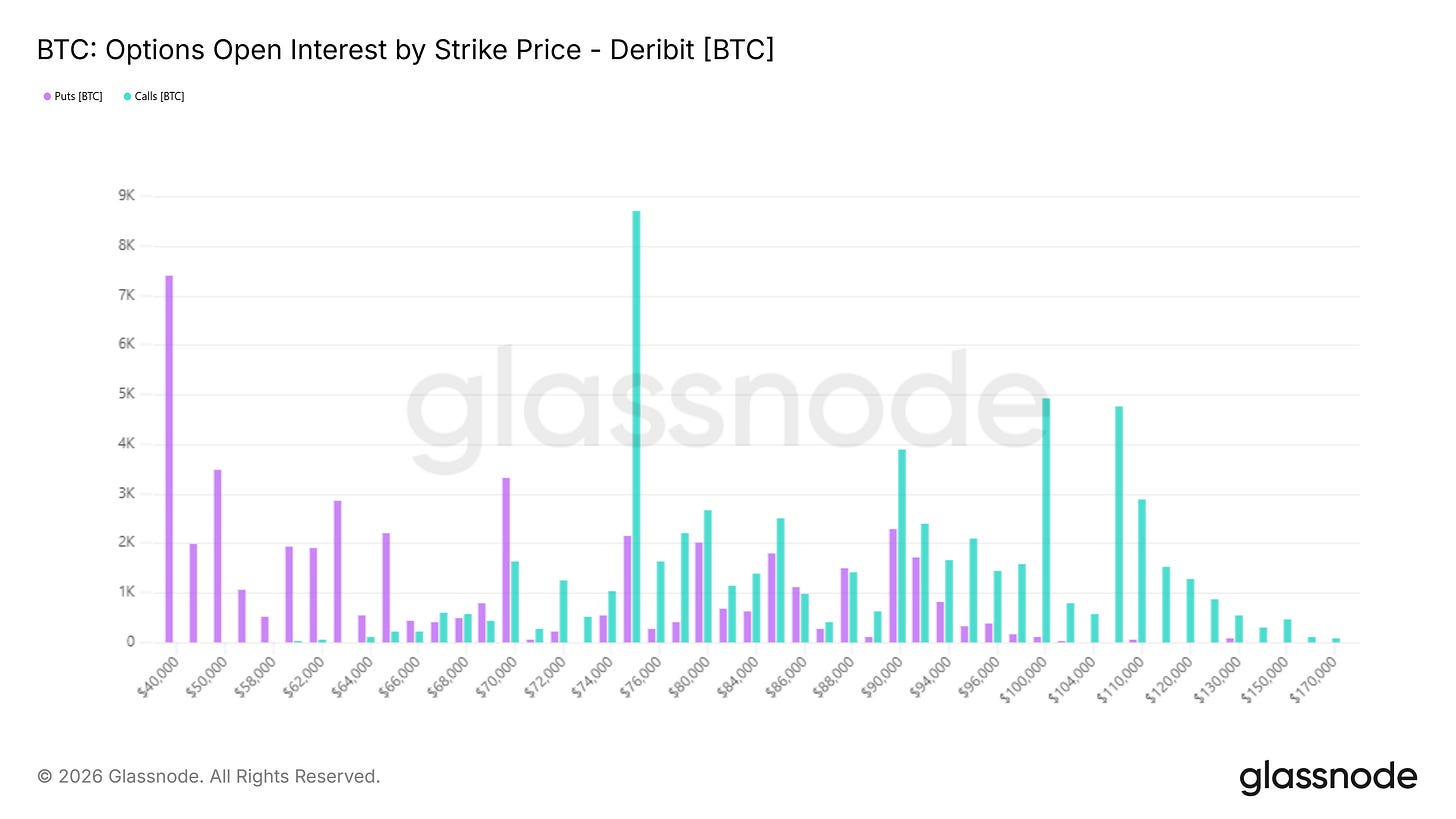 Above 75k, call open interest is stacked across 80k, 85k, 90k, 100k, 105k, and 110k. This laddered upside positioning suggests that market participants are maintaining exposure to a broader recovery narrative. Upside convexity has not been abandoned.