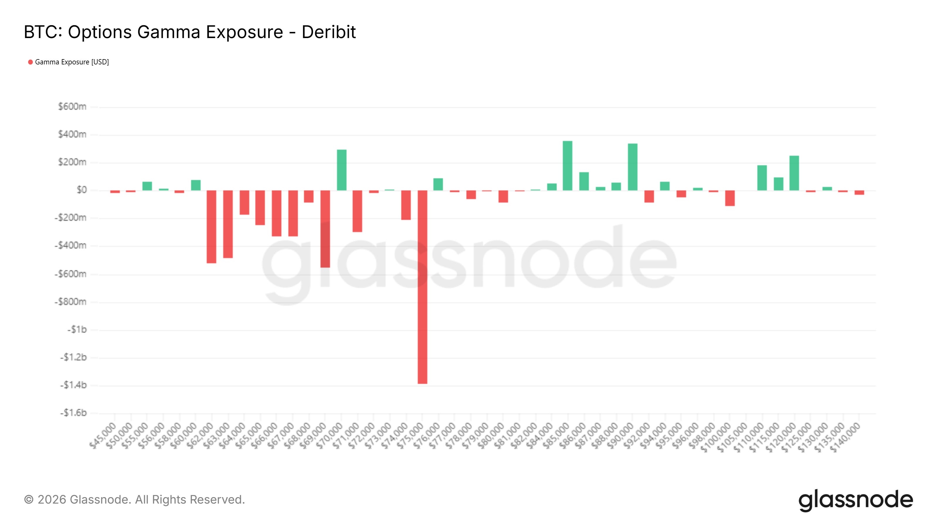 The aggregated gamma profile across all maturities reveals a clear imbalance. The dominant feature of the surface is a large negative gamma concentration centered around $75K, with additional negative clusters extending through the $69K to $74K region and into the mid-$60Ks. The $75K node stands out as structurally significant, representing the single largest pocket of negative gamma on the board.