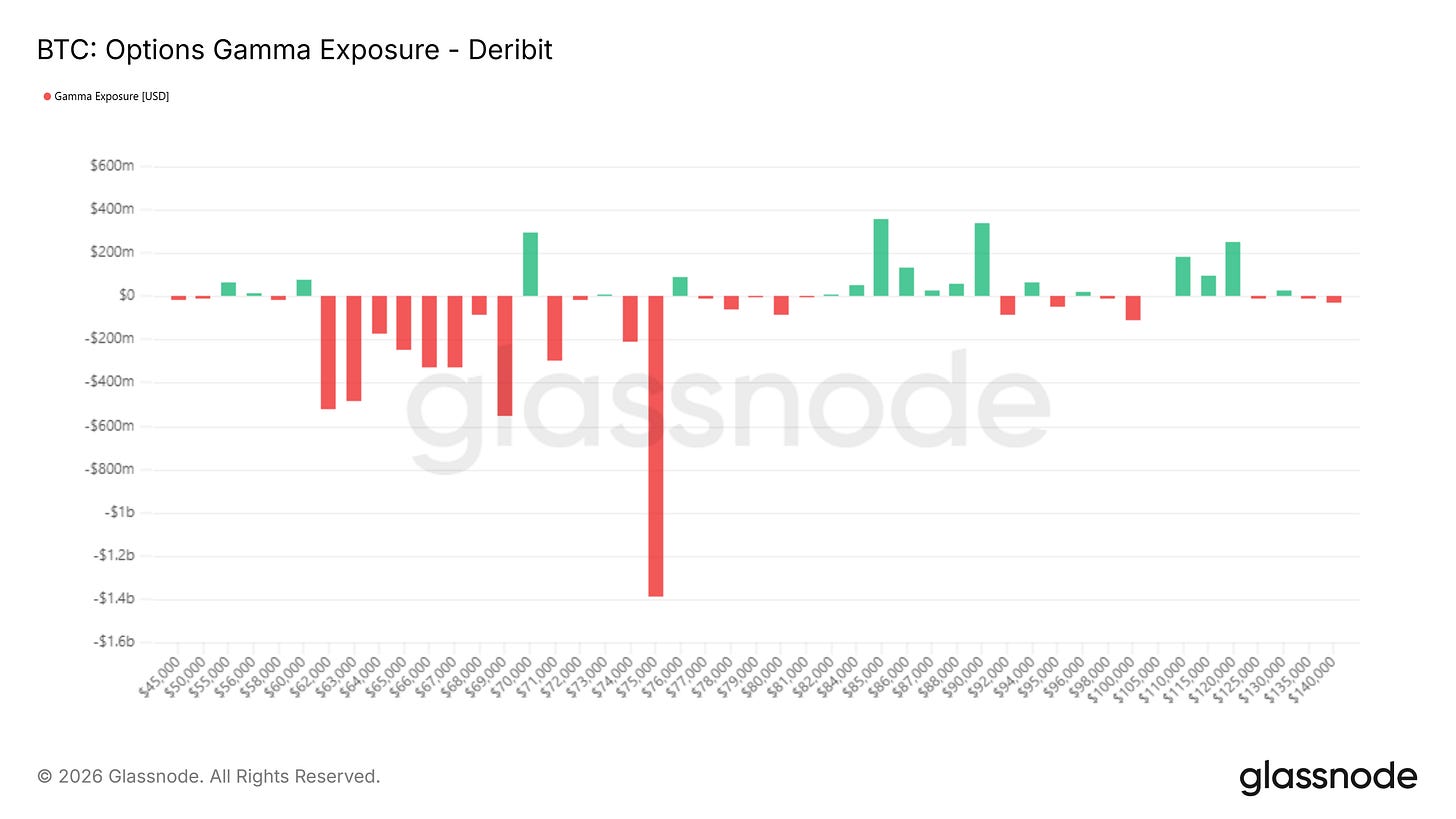 Below the mid-$60Ks, negative gamma persists but becomes more fragmented and less concentrated. The largest convexity risk was not at the ultimate lows, but in the mid-zone where positioning had accumulated during prior consolidation.