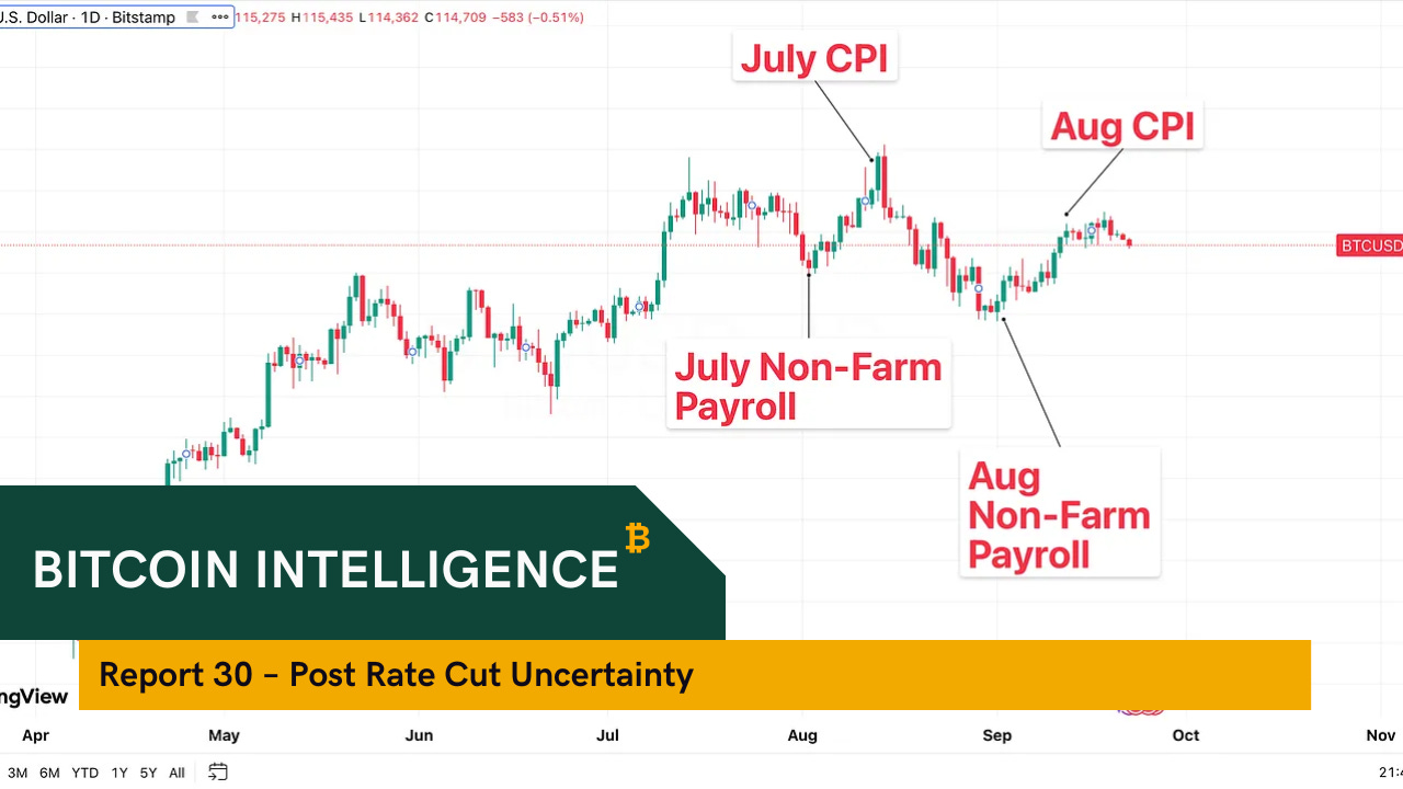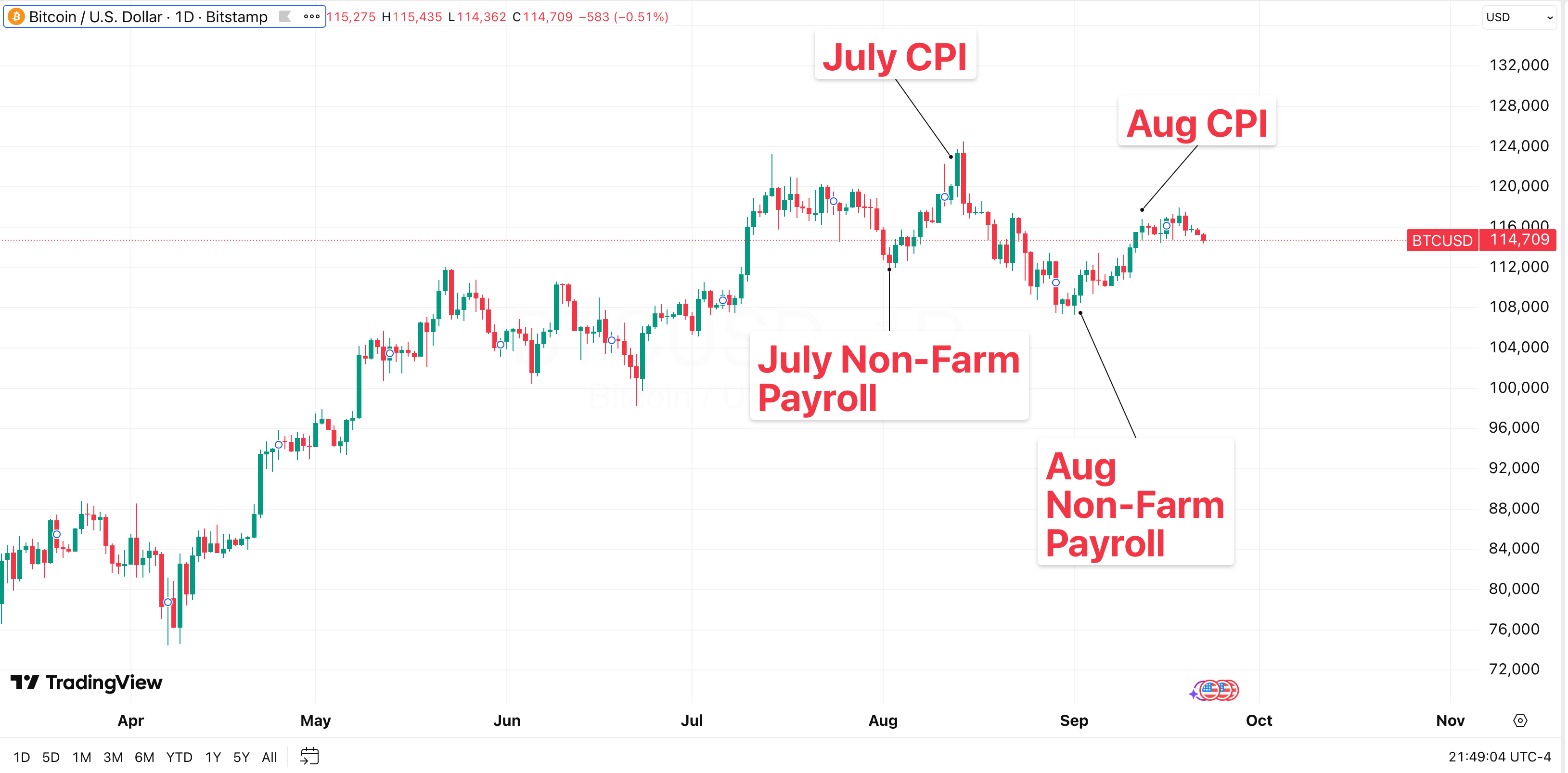 So rate cuts are here. In the last couple of months, macro data has been driving Bitcoin. First, the downside surprise in July non-farm payroll led to lower bond yield expectations and drove Bitcoin higher. Then, CPI data showed sticky inflation, driving yields higher and Bitcoin lower. We repeated this process one more time in August, where a weak labor report drove Bitcoin higher and sticky inflation tempered expectations again.